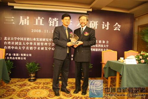 北京大學中國直銷行業(yè)發(fā)展研究中心執(zhí)行主任陳得發(fā)教授向公司總裁胡瑞連頒發(fā)捐贈紀念品