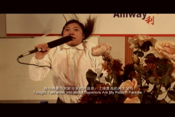 錄像裝置作品由八個頻道組成,分別是《超越自我》《集體造夢》《財富講壇》《分享淚水》《集體謀略》《絕對信任》《你不會死》《意亂情迷》,每個部分片長2-3分鐘。錄像內(nèi)容全部來自安利Amway駐中國公司的員工培訓(xùn)科目。錄像的表演者全部是來自雜技團的演員,他們處于顛倒的狀態(tài)中進行表演,在后期錄像編輯時,再把畫面做顛倒處理,看上去仍是“正常”的培訓(xùn)活動。