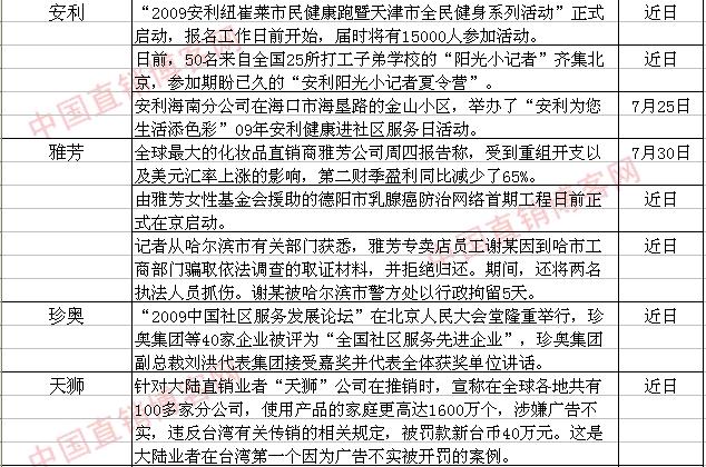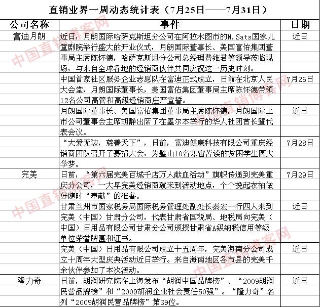 當(dāng)前位置:新聞資訊首頁 >> 行業(yè)動態(tài) >> 直銷界一周動態(tài)統(tǒng)計(jì)表(7月25日—7月31日)