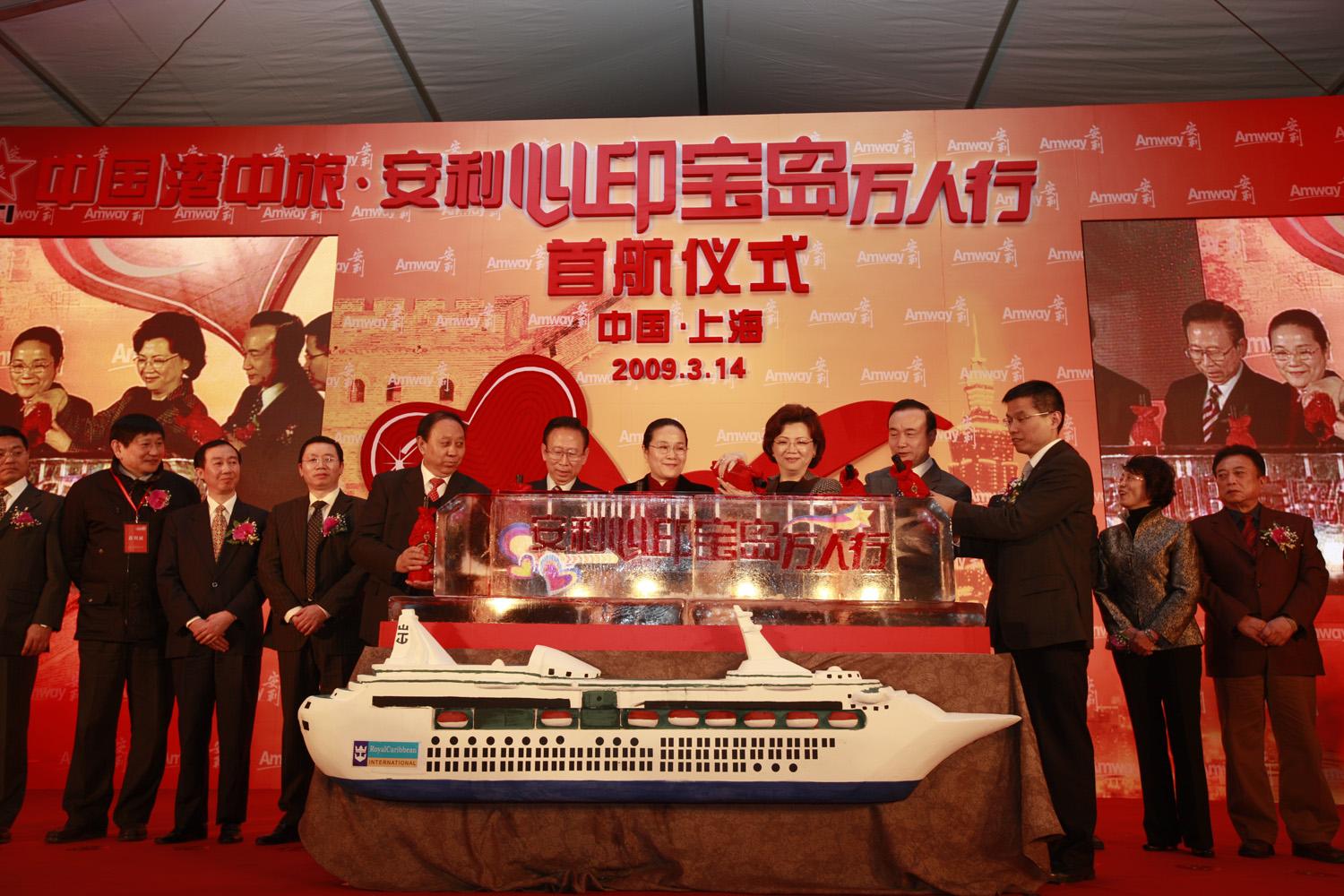 中國港中旅集團有限公司在碼頭舉辦了隆重的首航儀式。上海市副市長趙雯、國務(wù)院臺灣事務(wù)辦公室交流局局長戴蕭鋒、中國港中旅集團副總經(jīng)理許慕韓、美國安利公司執(zhí)行副總裁、安利(中國)日用品有限公司董事長鄭李錦芬等領(lǐng)導(dǎo)和嘉賓出席儀式并致辭。