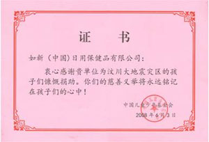 正在香港參加大中華區區域大會的如新管理團隊,在聞訊地震的第一時間,宣布向災區同胞捐出81萬份價值540萬人民幣的蜜兒餐。其中,如新集團通過中國兒童少年基金會,捐出的第一批價值2,200,800元的蜜兒餐,已經送到重災區身心俱傷的孩子們手中。為表彰如新集團在救助災區孩子的行動中,貢獻出來的愛心,中國兒童少年基金會特向如新集團頒發此證書,代為轉達災區兒童對如新大家庭的真誠謝意。