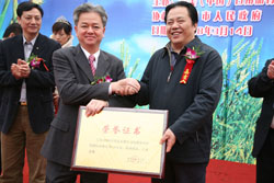 古潤金董事長代表完美公司向湖南災區捐贈價值120萬元的農用化肥,湖南省紅十字會黨組書記、常務副會長曾凡國(右)接受了捐贈牌