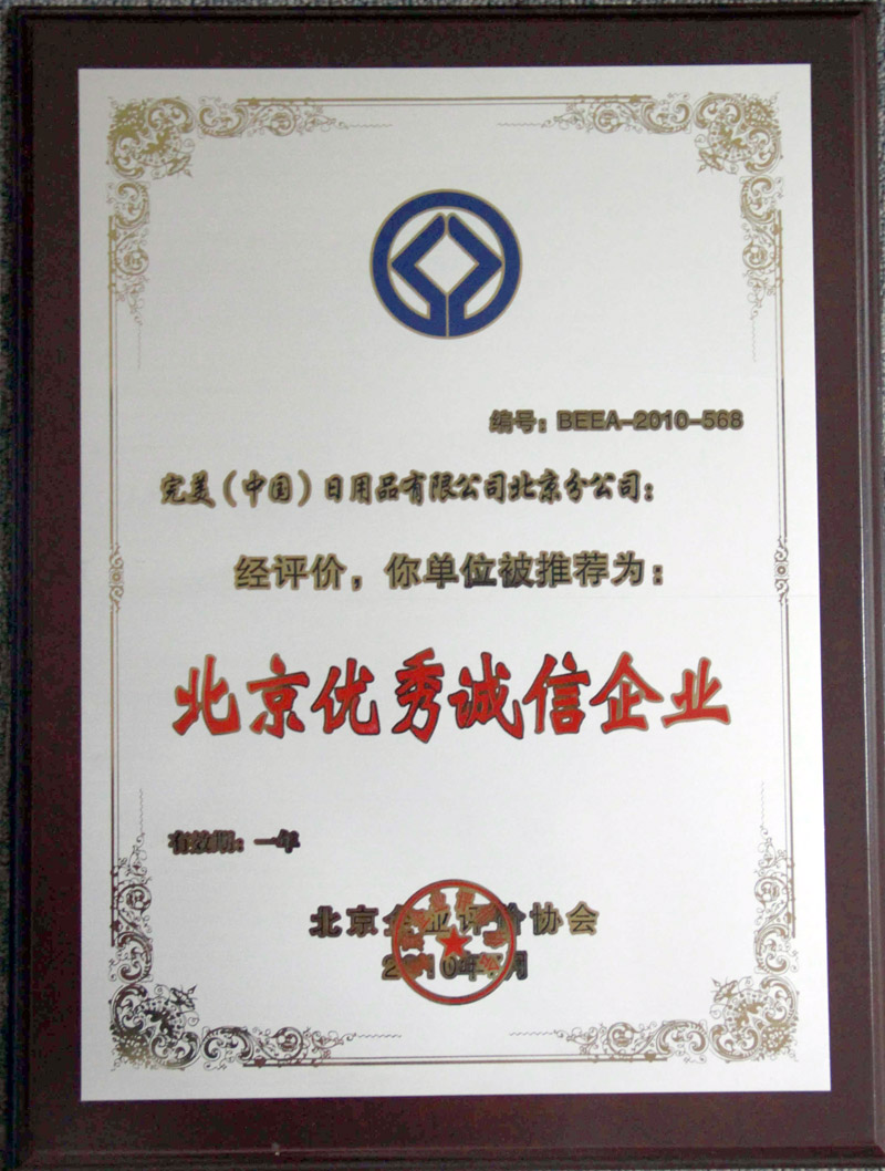 完美北京分公司獲“北京優秀誠信企業”榮譽稱號