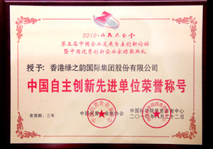 2010年8月22日,由中國民營企業家協會、中國經濟社會發展研究會等單位共同舉辦的“第五屆中國企業發展自主創新論壇暨中國優秀創新企業頒獎典禮”在人民大會堂召開。綠之韻集團榮獲“中國年度創新企業”、胡國安董事長榮獲“中國企業年度創新人物”榮譽稱號,綠之韻國際市場運營副總裁李繼前出席會議并代表企業接受頒獎。