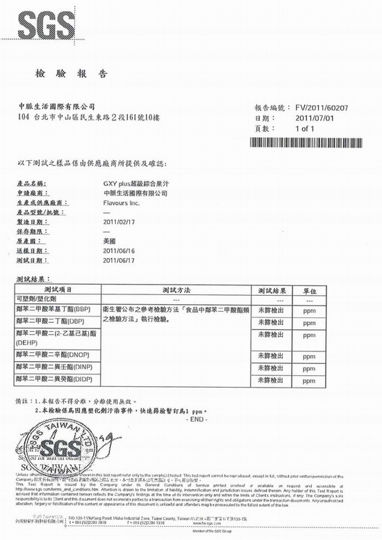 中脈國際同時亦主動將此二項產品送至臺北市政府衛生局檢驗室及SGS進行檢驗,日前已完成化驗,報告結果證實此二項產品均并未含BBP、DBP、DEHP、DNOP、DINP、DIDP等有毒塑化劑成分。