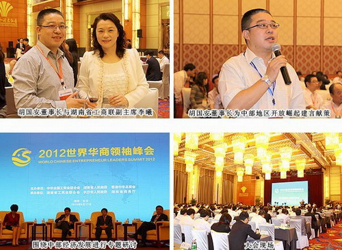2012年5月17日,由全國工商聯、湖南省政府、香港中華總商會共同主辦的“2012世界華商領袖峰會”在長沙舉行。全國政協副主席、全國工商聯主席黃孟復,中共湖南省委副書記、省人民政府省長徐守盛,湖南省政協主席胡彪,中共湖南省委常委、長沙市委書記陳潤兒等各級領導出席會議,來自海外和港澳臺地區的主要華商團體領袖及境外知名華人企業家、中部六省工商聯負責人、湖南知名企業代表等400多人參會,共推中部崛起。中國工商理事會常務理事、湖南省政協委員、省工商聯(總商會)常委、綠之韻集團董事長胡國安應邀出席,為中部地區開放崛起建言獻策。