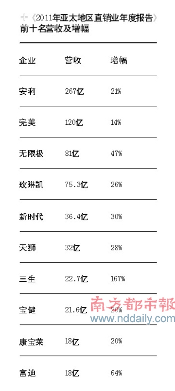 《2011年亞太地區直銷業年度報告》顯示,安利、完美、無限極分別以267億、120億和81億的營收,21%、14%和47%的增速位列前三名,玫琳凱、新時代、天獅、三生、寶健、康寶萊、富迪則以75.3億、36.4億、32億、22.7億、21.6億、18億、18億占位前十。而最早拿牌的雅芳大跌52%,僅有10億營收,跌至第15名,葆嬰和哈藥也分別跌去8%和94%,成為除廈門金日、安然、炎帝、愛茉莉幾家新拿牌無同比漲跌幅企業之外,僅有的三家負增長公司。