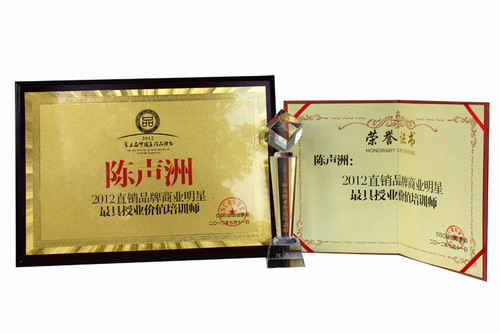 獲得組委會(huì)評(píng)選出的《2012直銷品牌商業(yè)明星 最具授業(yè)價(jià)值培訓(xùn)師》