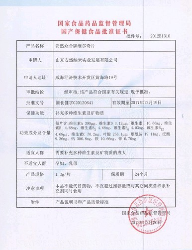 經過國家食品藥品監督管理局的長期嚴格審查,安然眾合牌維爾奇片喜獲國家食品藥品監督管理局國產保健食品批準證書,俗稱“小藍帽”。